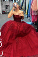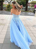 Elegant fuchsia long prom dress features strapless neckline, lace qppliques and zipper back.