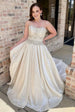Modsele beige long wedding dress features strapless neckline, bead embellishments and sweeping A-line skirt.