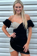 This black homecoming dress features a sweetheart strapless neckline with beaded detail, a pair of detachable short puff sleeves, and a sheath silhouette with a faux-wrapped design.