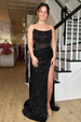 This mermaid silhouette dress features a strapless neckline, a sheer waist with boning inside, a full sequin tight bodice, and a floor-length skirt with a leg slit.
