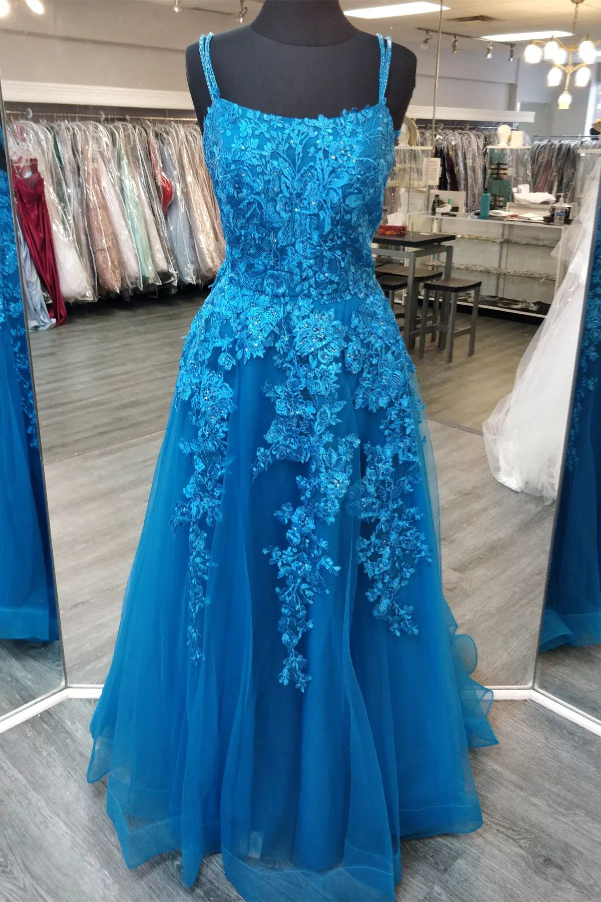 This A-line silhouette dress features double straps, and the floral embroidered appliques begin at the tight bodice that run down onto the skirt.