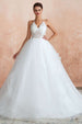Modsele white full length wedding dress features halter neckline, lace appliqués bodice, backless, and sweep multi-layered A-line train.(No veil attached)