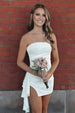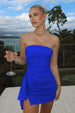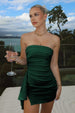 Chic strapless ruched short homecoming dress featuring an asymmetrical hem for a modern twist. This flattering mini hugs your curves with soft ruching and offers a sleek, strapless neckline—perfect for homecoming, parties, or any stylish night out.