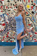 Elegant pink long prom dress features crew neck, spaghetti straps and hight slit.