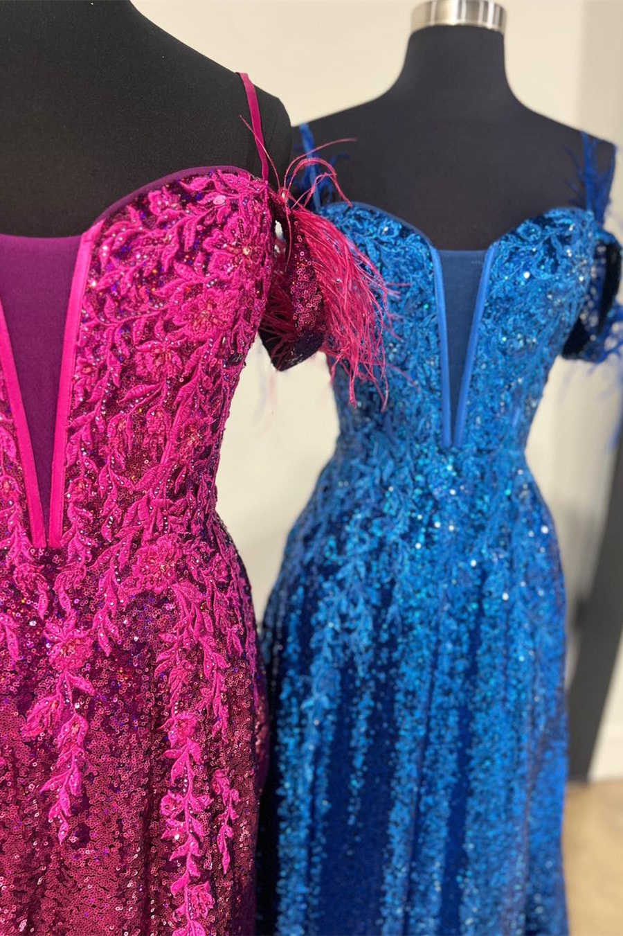 Expertly crafted with a plunging neck and insert mesh, this long prom dress features a showstopping sequin bodice adorned with delicate appliques. The cold shoulder design adds a touch of elegance with feather detailing. Complete with an A-line skirt, this dress will make you stand out on any special occasion.