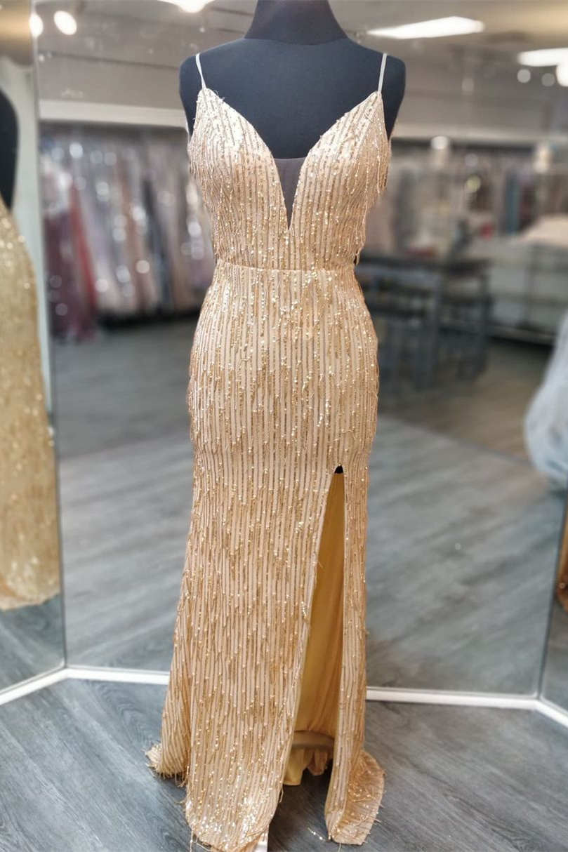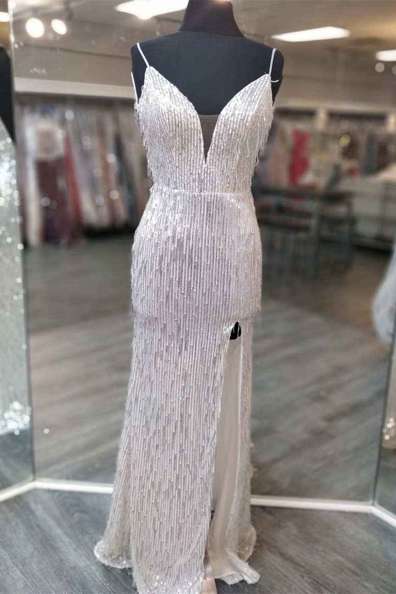 Elegant long prom dress features spaghetti straps, sequins and high slit. Inexpensive but Good Quality.