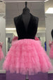 Indulge in the luxurious combination of black halter top, lavender tulle material, and a plunging neckline. The tiered ruffle skirt boasts a playful bow accent at the back, while the above-knee length and open back add an alluring touch.