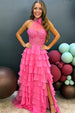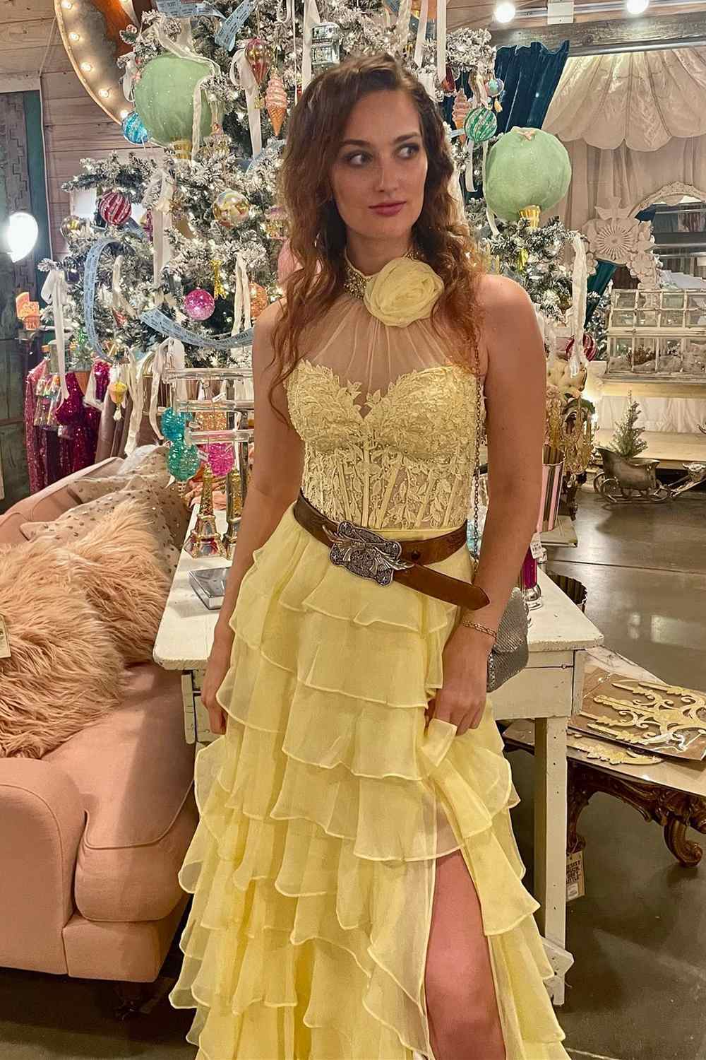 This stunning prom dress features a high neck and beaded chocker for a contemporary look. The 3D flower adds a unique touch of style, while the ruffle chiffon skirt and high slit offer movement and a hint of glamour. Perfect for any occasion.