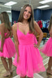 This chic hot pink Homecoming Dress is tailored with a deep V-neckline, adjustable spaghetti straps that create a corset-style lace-up back, a snug bodice with pleated detailing, and a voluminous A-line skirt with structured boning along the hemline.