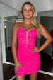This hot pink homecoming dress features a plunging V slit with a sheer mesh overlap on the top bodice, spaghetti straps lace-up on the back, and a sheath silhouette full of sequins.