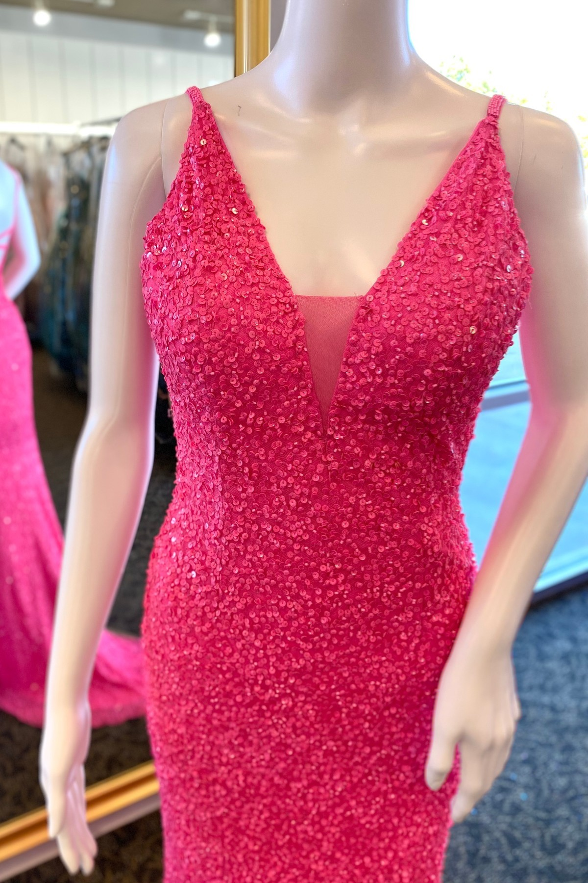 This mermaid silhouette dress features a plunging V-neckline with a sheer mesh overlap, and a full sequin floor-length skirt.