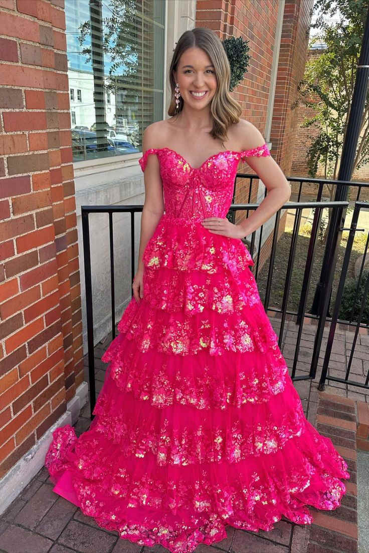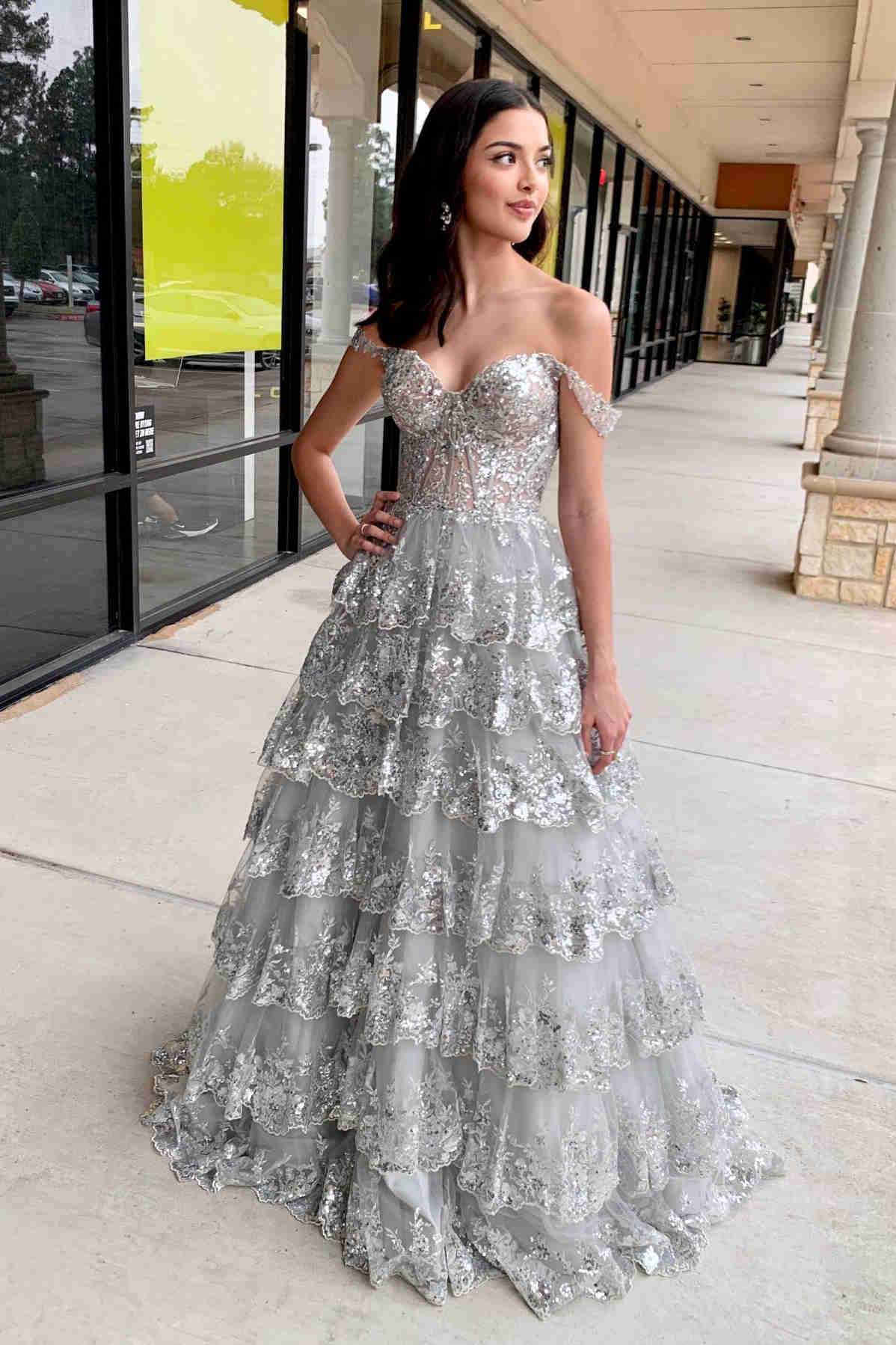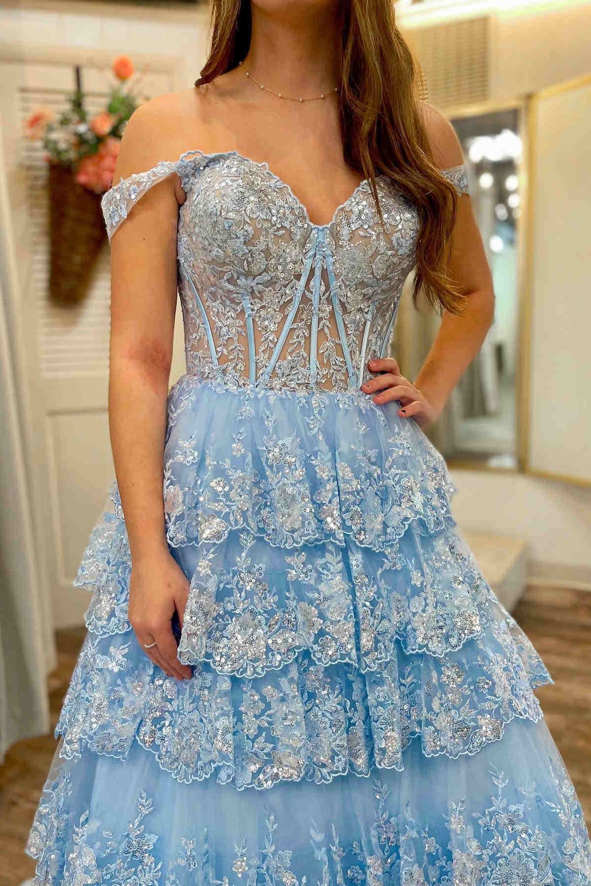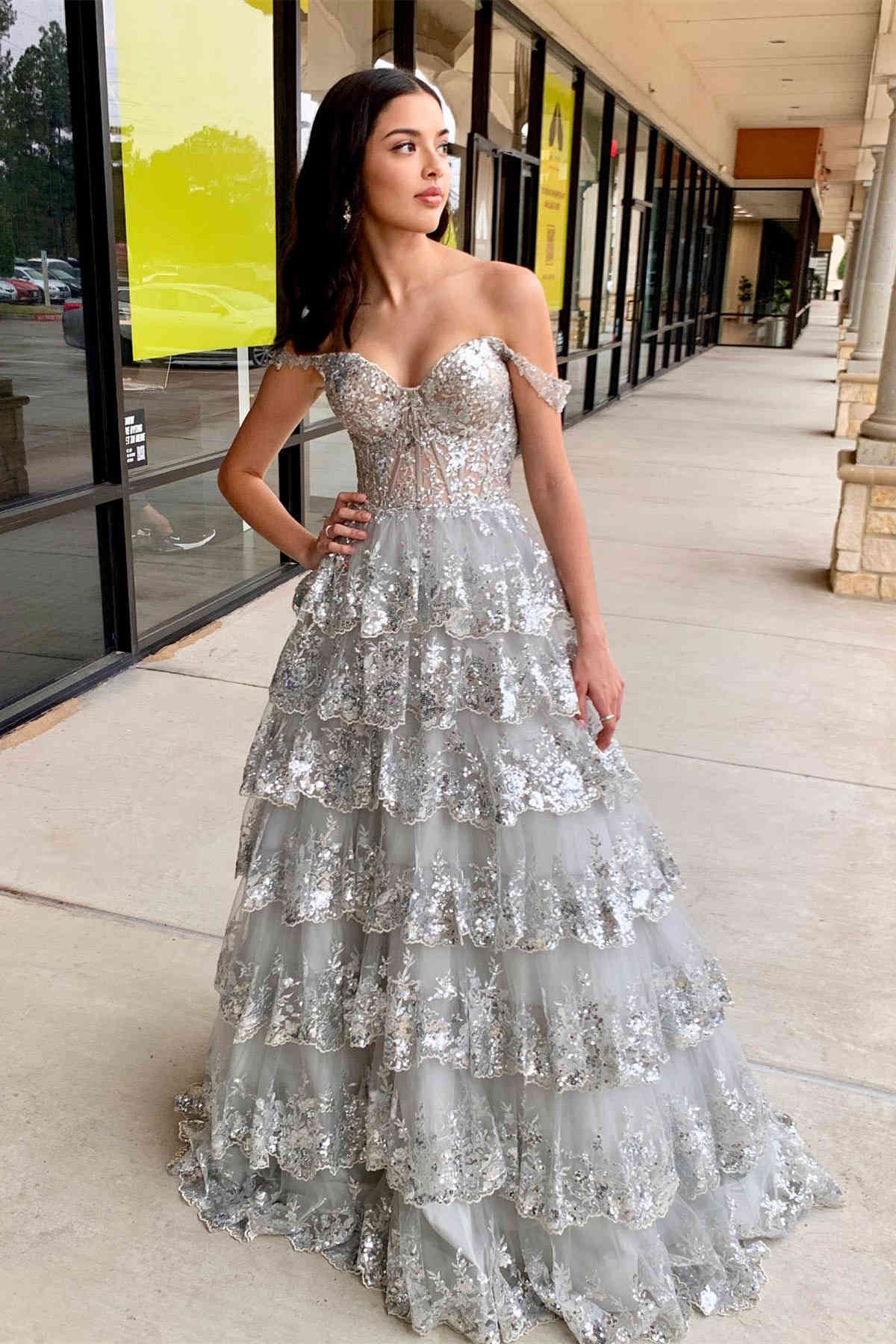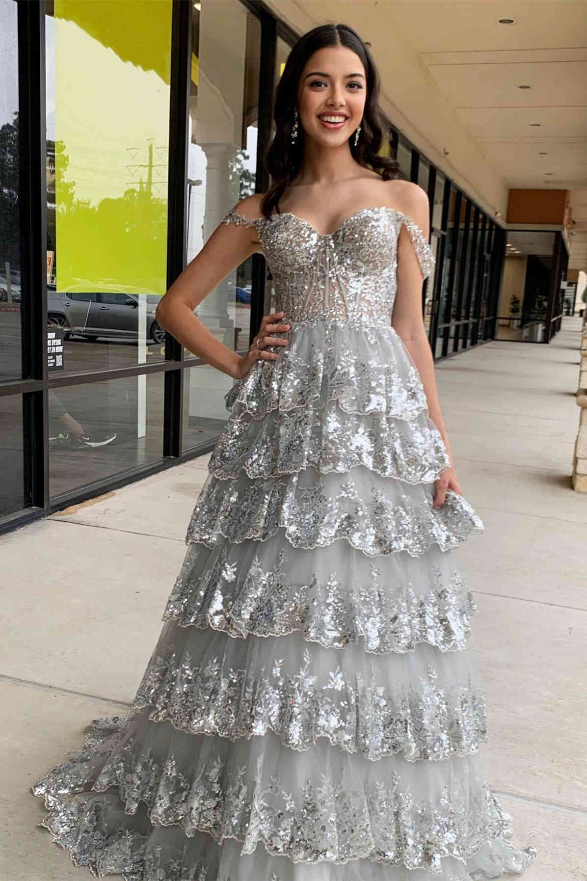This elegant ball gown features an off-the-shoulder neckline, a corset bodice with sequin embellishment, and a tiered tulle skirt. A must-have for formal occasions, the dress has a stunning lace-up back, creating a flattering and secure fit. Perfect for any occasion.
