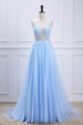 Expertly crafted with a plunging v-neck and insert mesh, this Lace-Up Light Blue Sheer Corset A-Line Formal Dress is perfect for any formal occasion. The sheer corset bodice boasts beautiful appliques, while the a-line skirt enhances your silhouette. The lace-up back is easy to adjust, adding a touch of elegance.