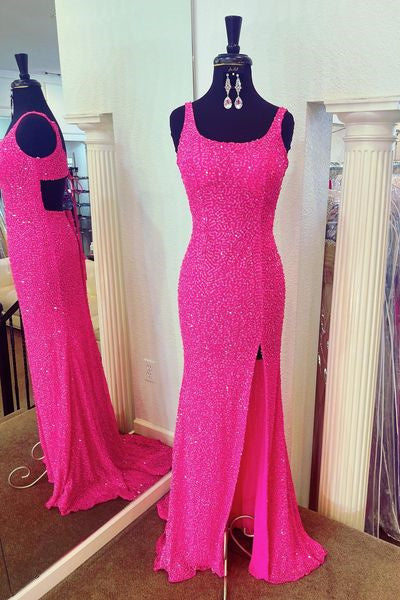 Elegant hot pink long prom dress features square neck, sequins and lace up back.