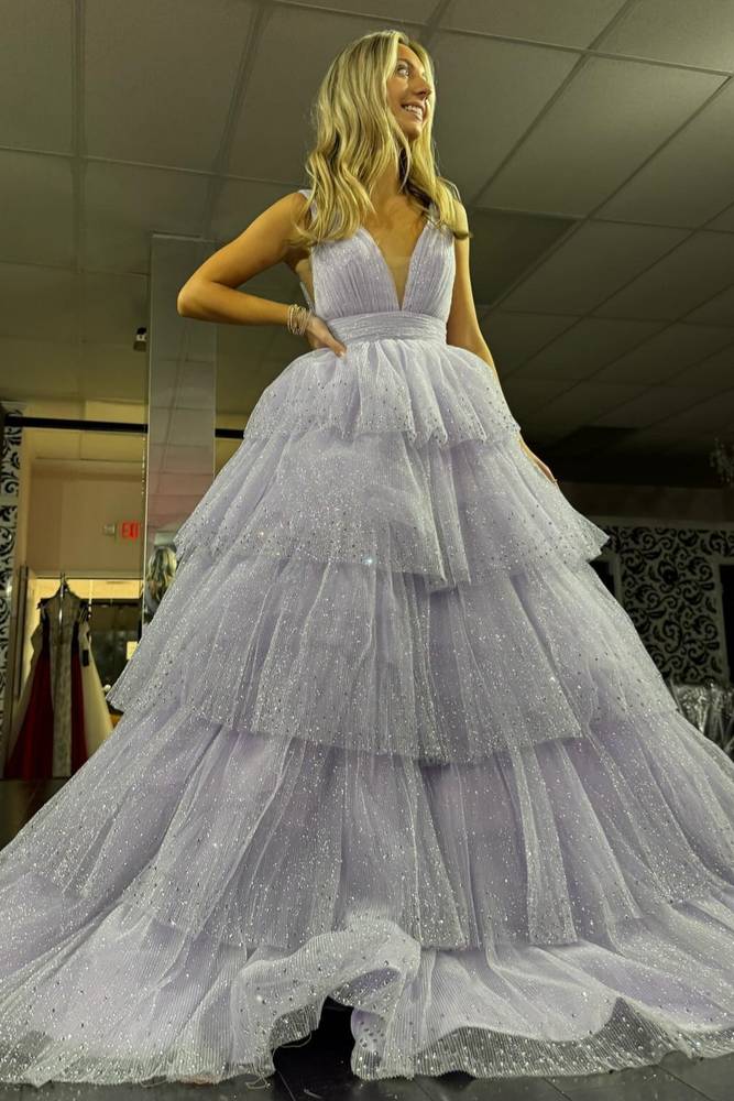 Expertly crafted with a stunning V-neckline and delicate lavender sequins, this prom dress exudes elegance. The tulle ruffle tiered design adds a touch of whimsy while the V-neck accentuates your figure. Perfect for prom or any formal occasion, this dress is sure to make a statement.