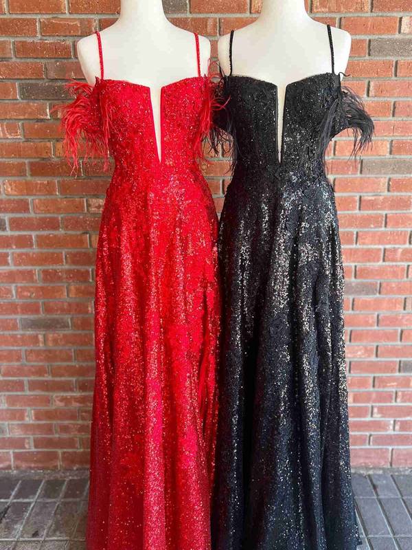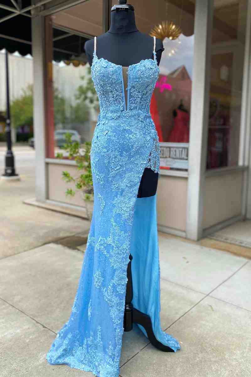 Elegant light blue long prom dress features straps, lace appliques, high slit and detachable feathered shoulder.