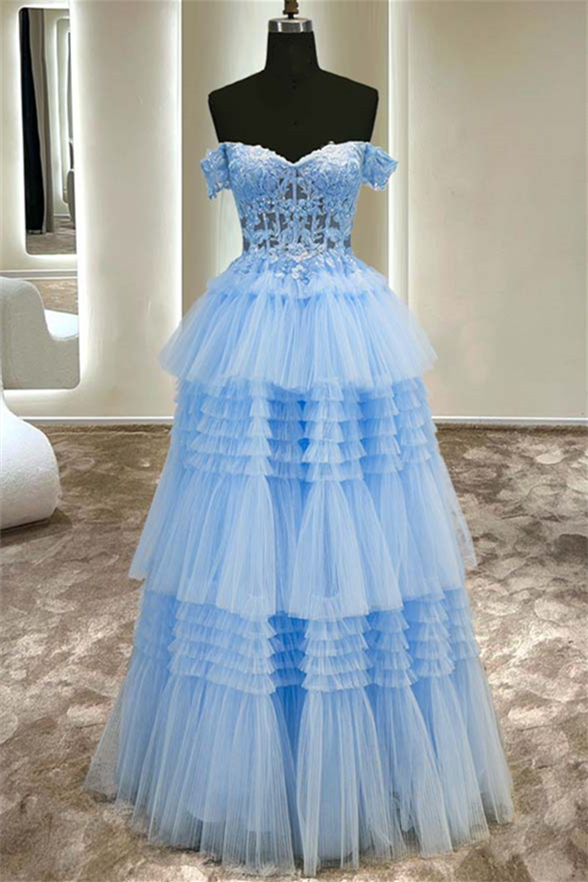 This A-line silhouette dress features an off-the-shoulder neckline, a corset bodice with beaded embroidered appliques, a lace-up back detail, and a floor-length skirt with multi-layers.