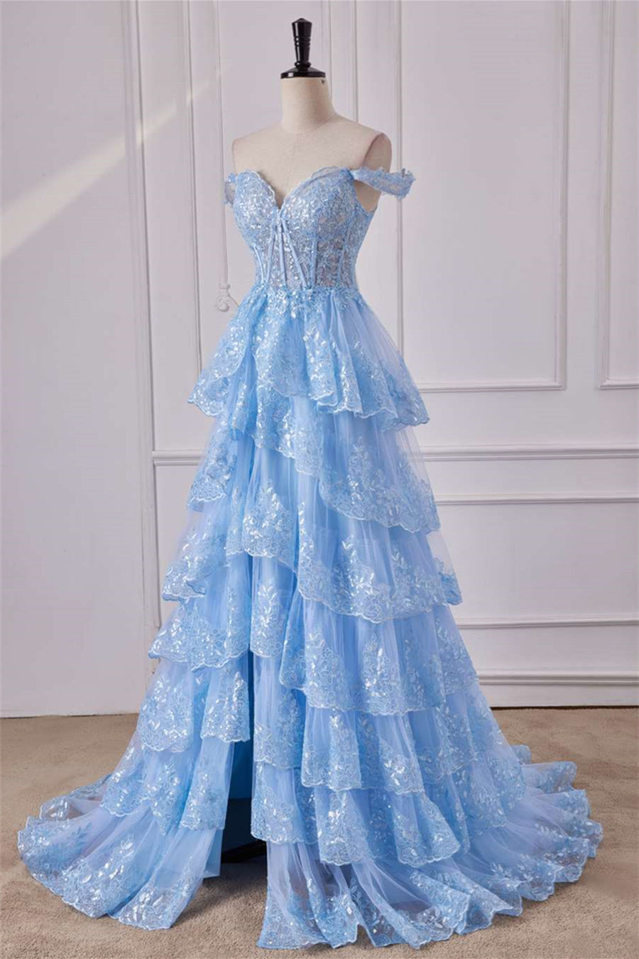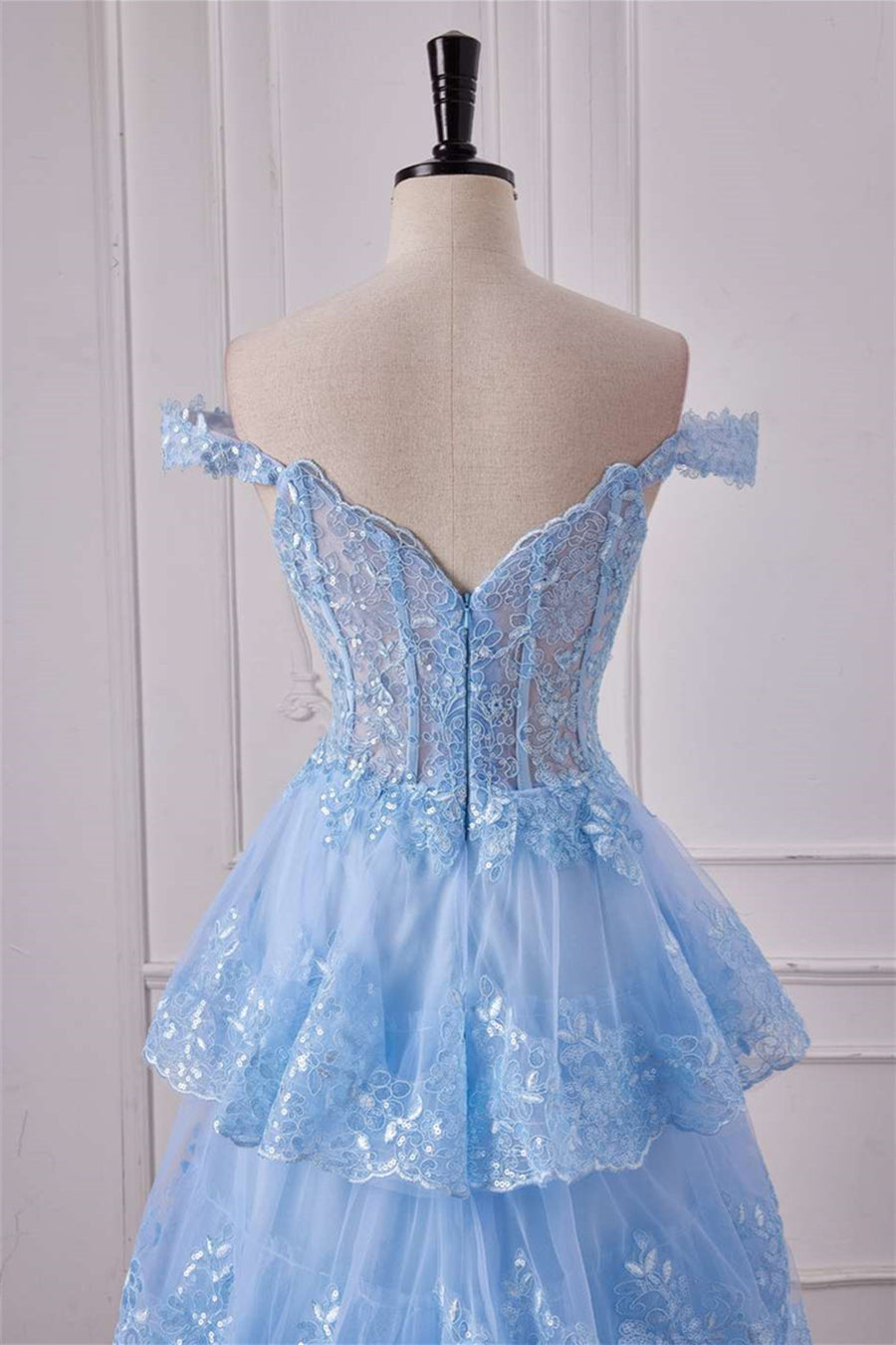 Expertly designed for a stunning silhouette, our Light Blue Floral Prom Dress boasts an elegant off the shoulder neckline and sheer corset bodice adorned with delicate appliques. The layered skirt adds a touch of romance, while the side slit adds a hint of allure. Perfect for any formal occasion.