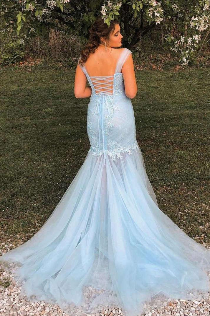 Light blue long prom dress in a mermiad silhouette features square neck and lace appliques.