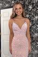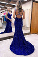 Elegant long prom dress features spaghetti straps, sequins and mermaid bodice.