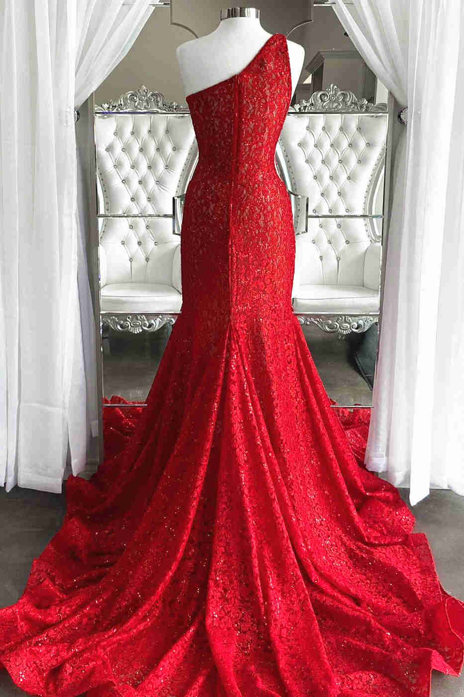 Elegant red long prom dress features one shoulder, lace and zipper back . Elegant and stunning, it will be your best choice for prom.