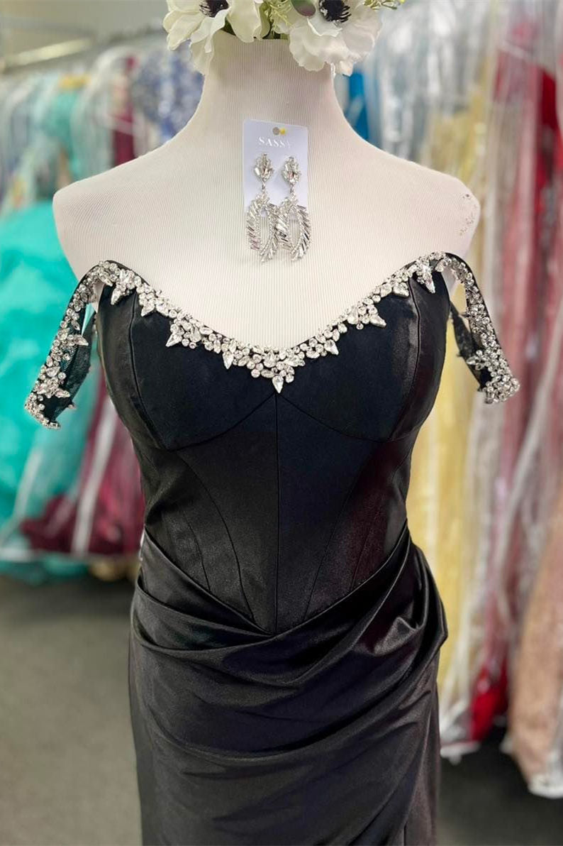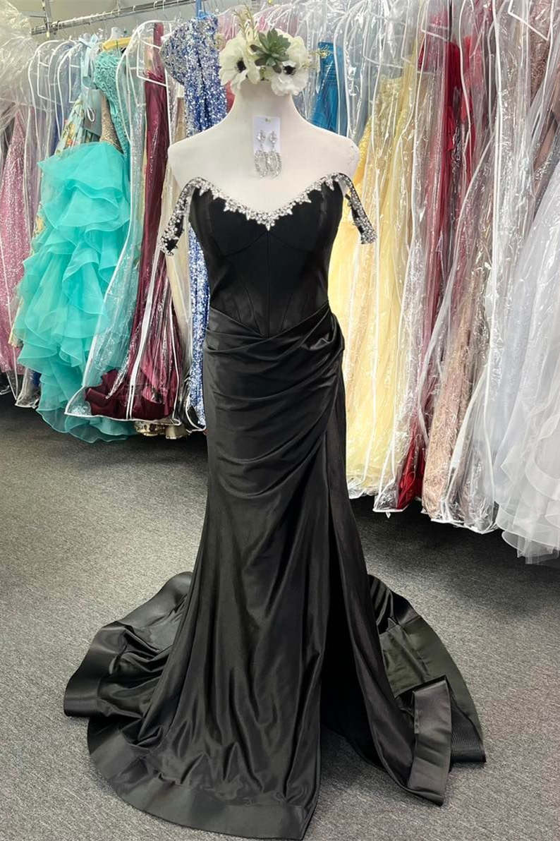 This sexy blue prom gown is perfect for any special occasion. It features an elegant off-the-shoulder neckline with beading details, a mermaid skirt, and a side slit to show off your glamorous look.