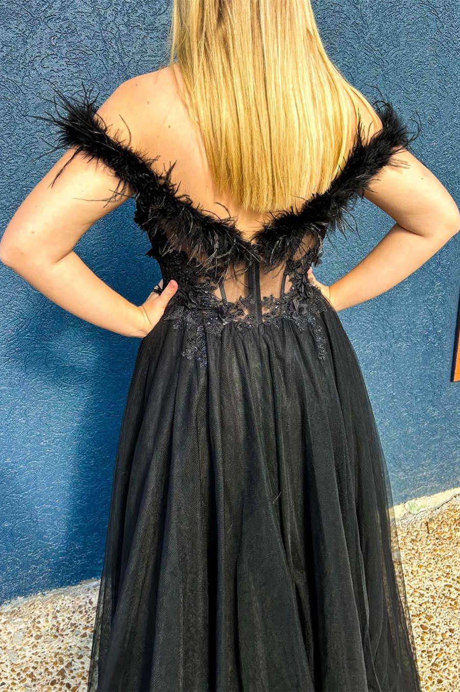 This Off the Shoulder Black Feathers Long Prom Dress will turn heads. With its sophisticated off the shoulder neckline adorned with feathers, sleek lace corset bodice, and a-line skirt with slit, you’ll be the toast of the party.