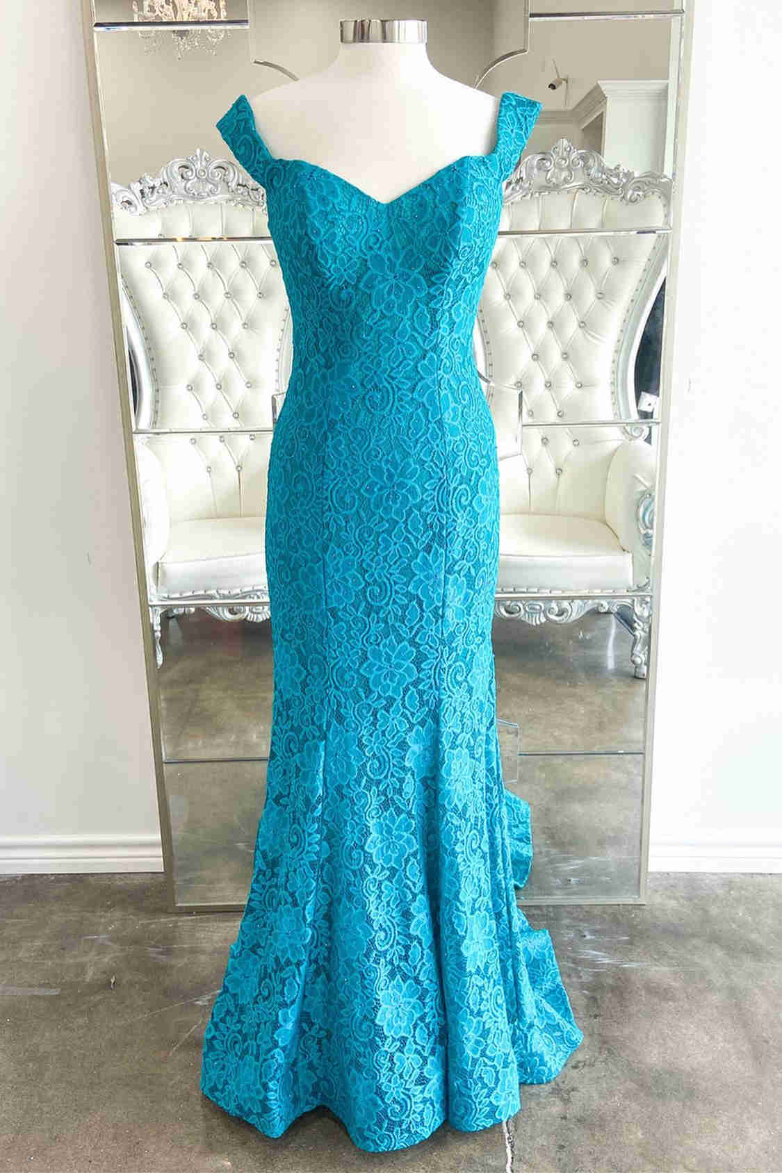 Elegant blue long prom dress features off the shoulder neckline, lace and zipper back . Elegant and stunning, it will be your best choice for prom.