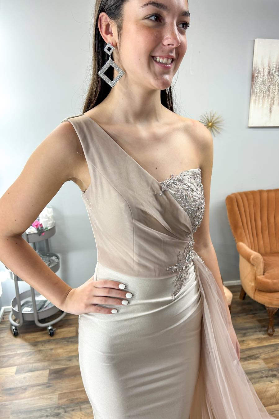 Made for a special night, this one-shoulder nude prom dress is exquisitely embellished with appliques and comes with a waist cape. A zipper back ensures a perfect fit. Bring sophistication to your special night.