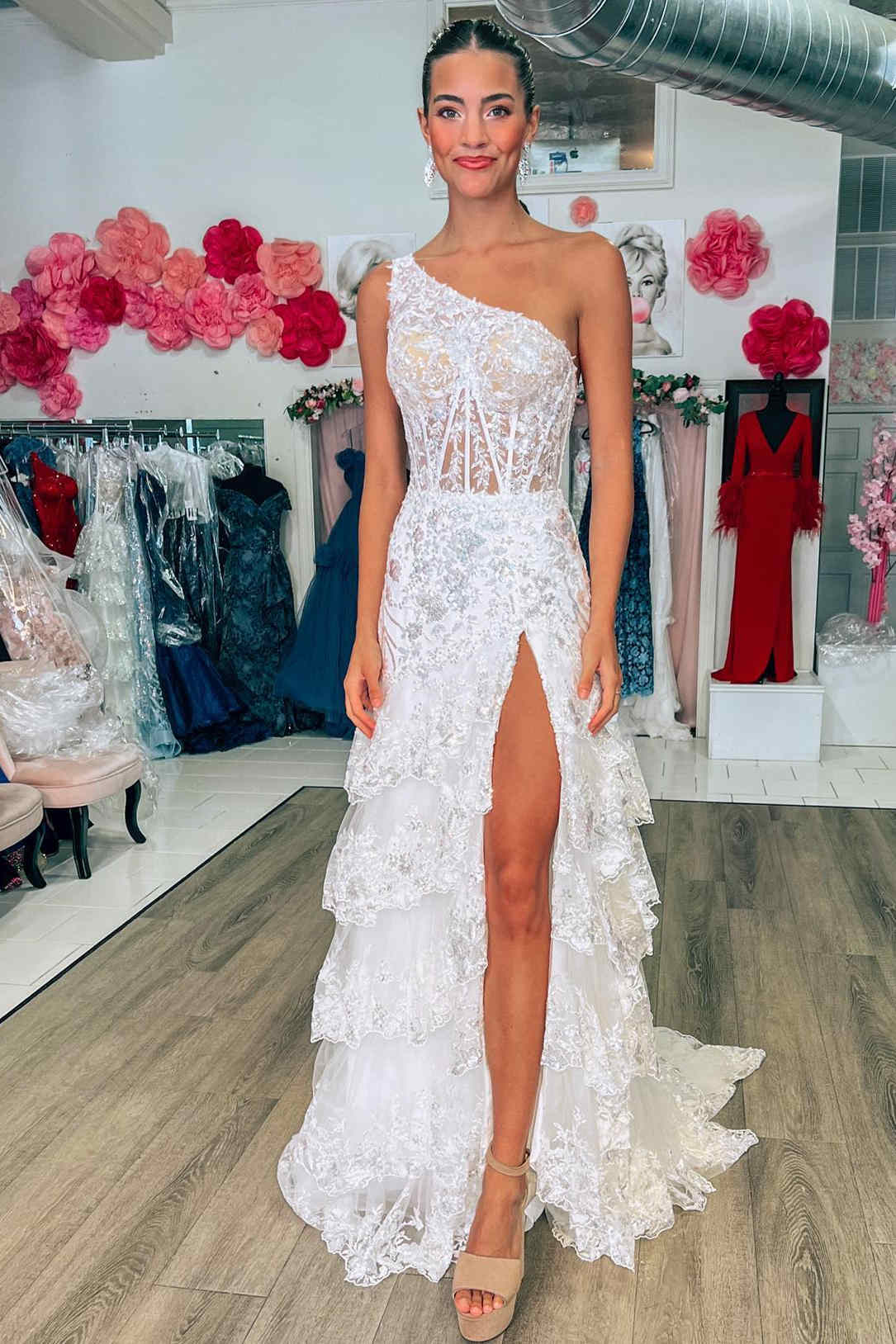 This elegant long prom dress features a one shoulder neckline, a tiered skirt with slit, and a zipper back.