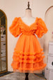 This distinctive orange homecoming dress features a classic V-neck neckline, puff sleeves, corset-style bodice embellished with ruffles, and a mini-length skirt with a ruffled hemline.
