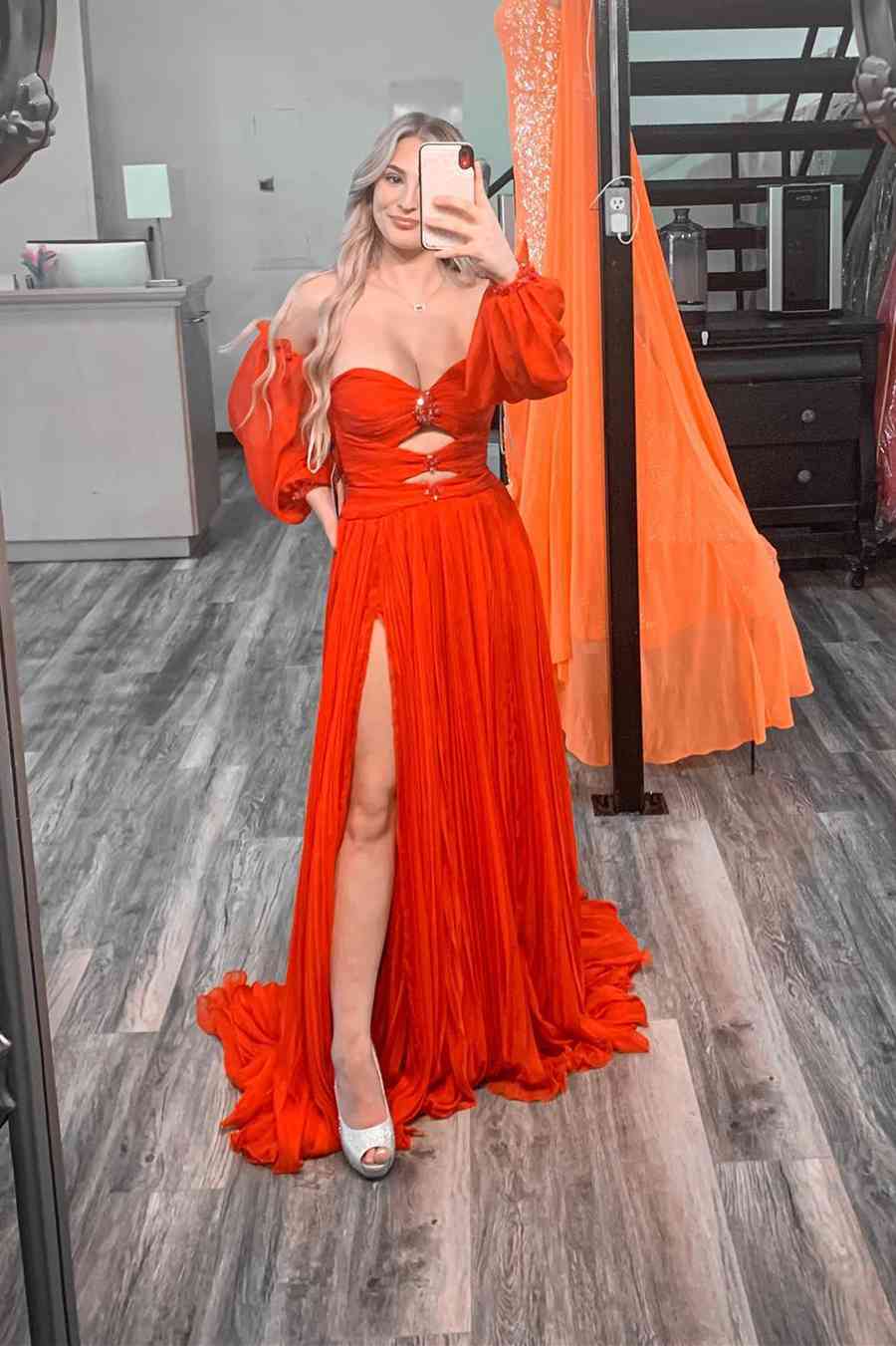 Elegant blue long prom dress features cut out frond, detachable long sleeves and pleated skirt.