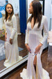 Elegant champagne long prom dress features v-neck, long sleeves and high slit. Dazzling sequins cover the long prom dress and illuminate the room as you twist and turn on the dance floor.