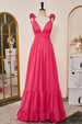 This stunning, floor-length prom dress boasts a plunging V-neck, pleated bodice, and ruffled straps for a romantic look. An A-line skirt ensures a flattering fit for any body type, while a lace-up back adds the perfect finishing touch. Show off your glamorous style in this gorgeous hot pink dress.