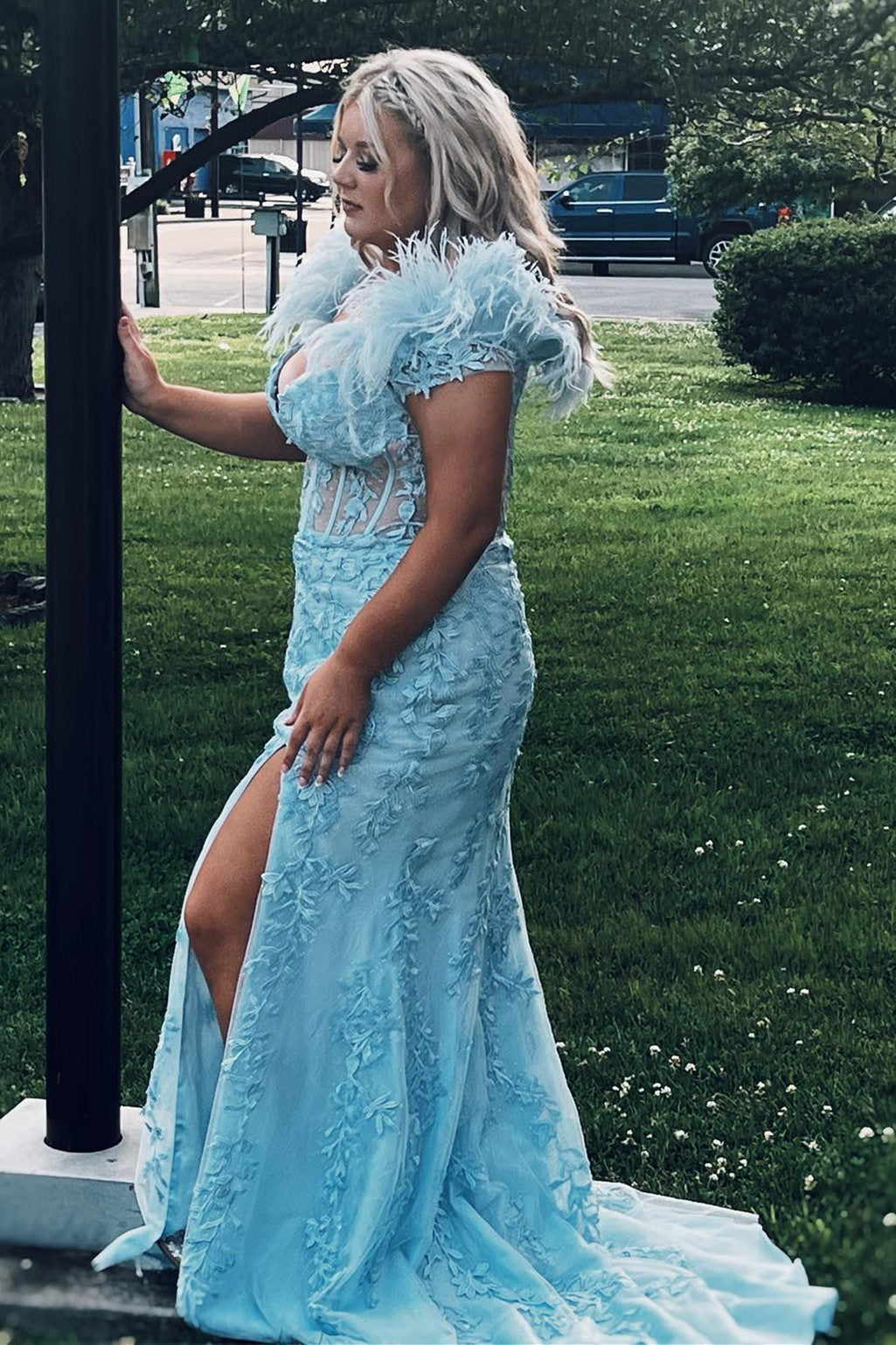 Elegant red long prom dress features plunging v-neck, lace appliques and feather shoulder.