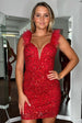 This red homecoming dress features a plunging V neckline with a sheer mesh overlap, feathers shoulder straps, and a sheath silhouette full of sequins.