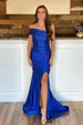 Elegant royal blue long prom dress features halter and high slit. Inexpensive but Good Quality.