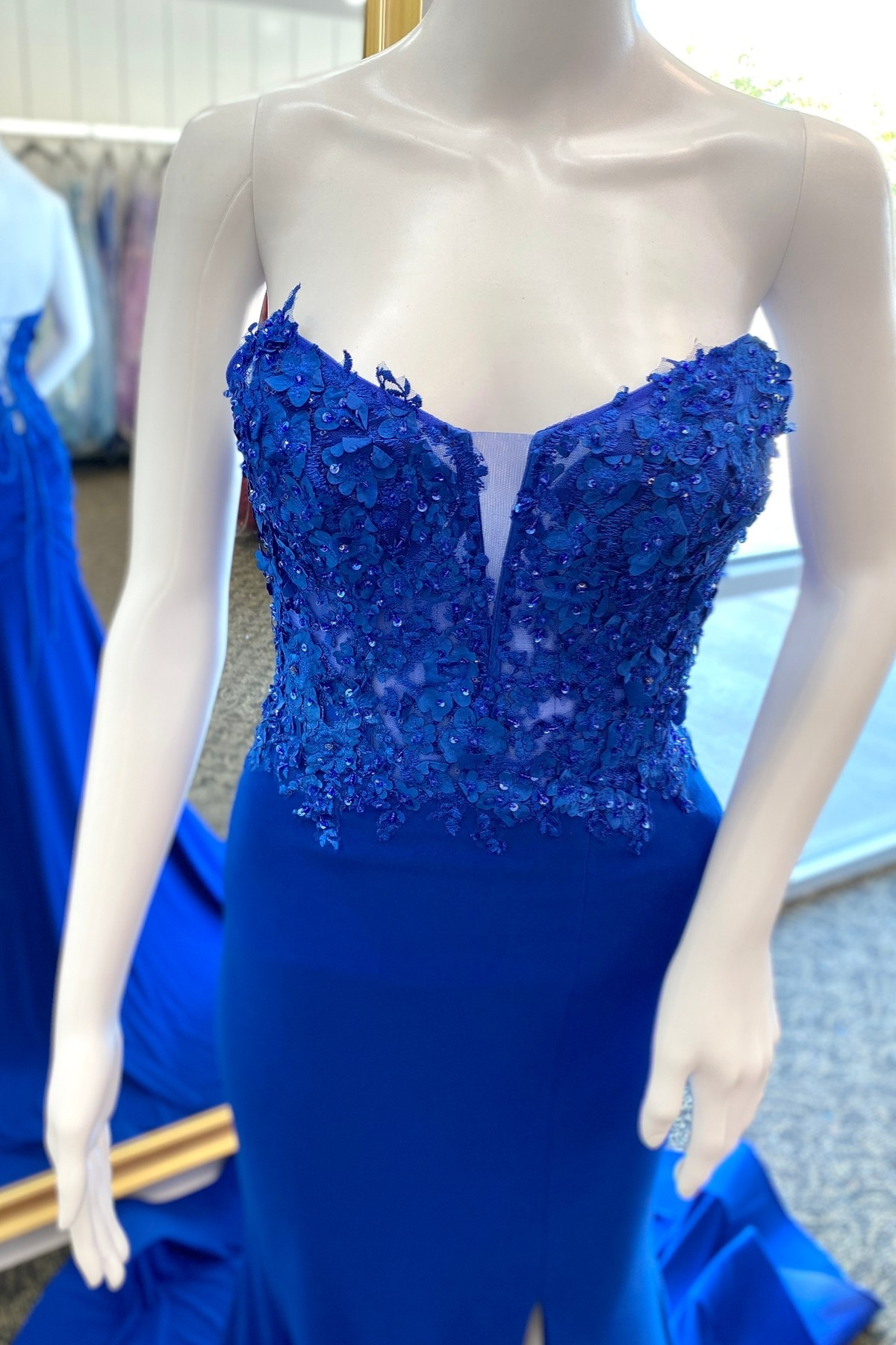 This regal mermaid dress boasts a strapless neckline with a sheer mesh plunging slit, a form-fitting bodice embellished with 3D appliques, and a full-length skirt complete with a leg slit.