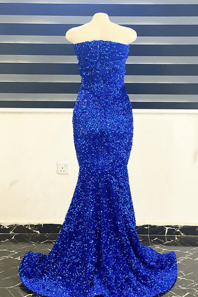 This long mermaid dress features a strapless neckline, a low-cut V-neck with a sheer mesh panel, and a full sequin-embellished bodice with a voluminous skirt that flares at the hem.