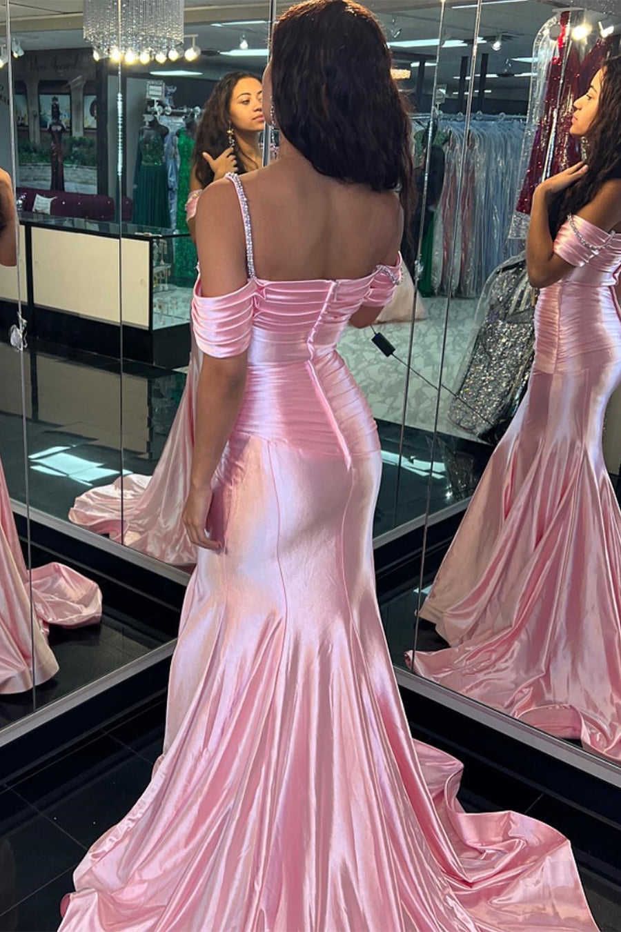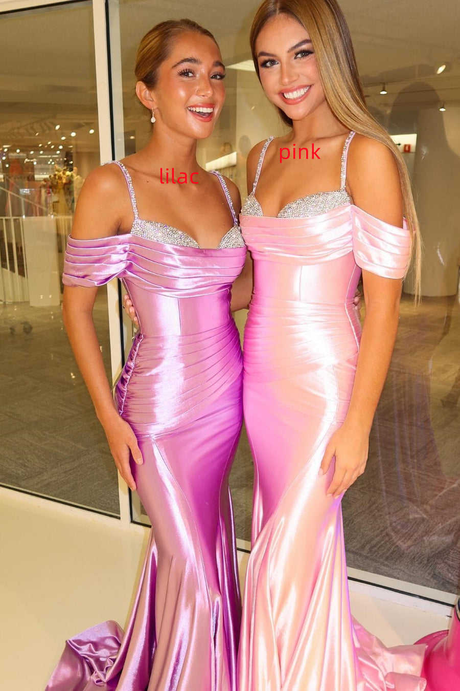 This elegant silver mermaid gown is the perfect choice for any special occasion. Crafted with straps adorned with rhinestones, cold sleeves, a pleated bust adorned with beads, and a flattering ruched waist, this dress will ensure you make an elegant statement.