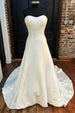Modsele white satin long wedding dress features strapless sweetheart neck, sweeping train and buttons up back.