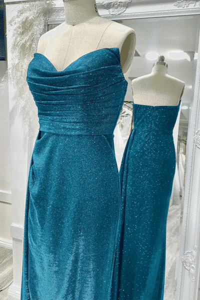 This floor-length mermaid-style gown boasts a strapless neckline, a fitted bodice with pleats, and full skirt with a slit along the leg.