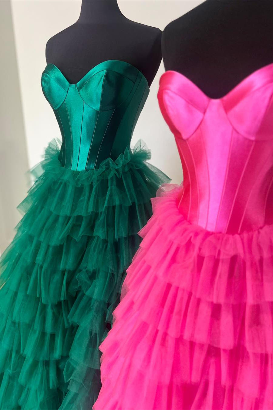 This black a-line prom dress is an elegant choice for a special occasion. It features a sweetheart neckline, a corset bodice for a figure-flattering fit, and a tiered skirt with a dramatic slit. The layered design creates a flowing silhouette.