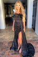 This long prom dress features a strapless neckline with feathers, a fitted bodice embellishment sequins, and a zipper back.