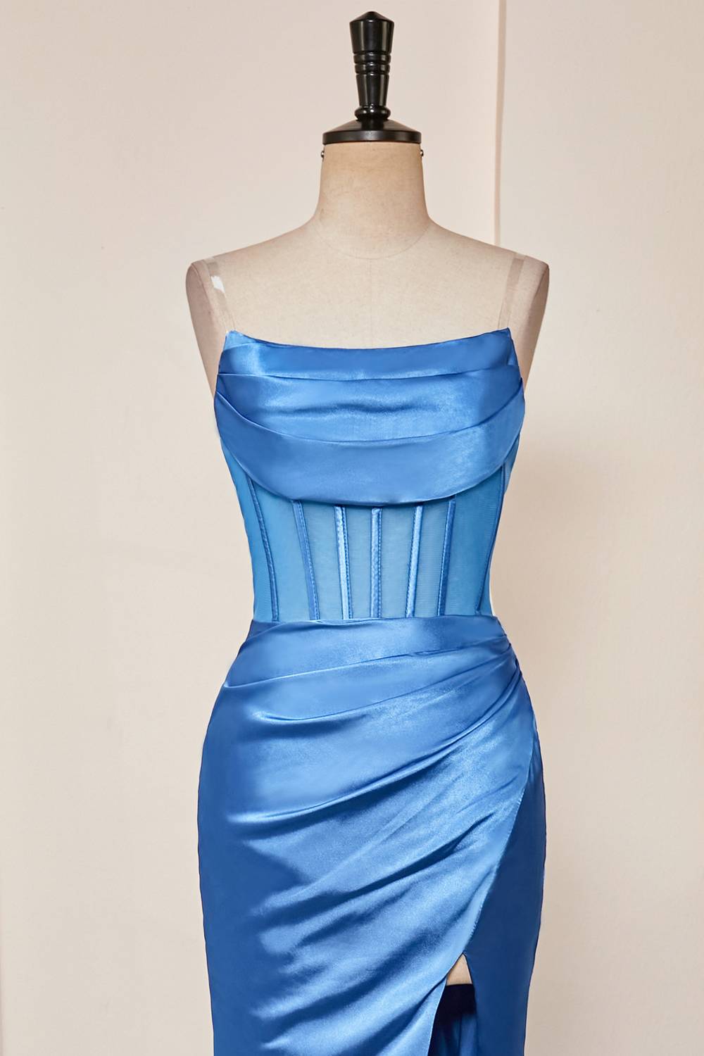 This stunning strapless prom dress features a mermaid skirt with a side slit for a touch of drama. The waist is embellished with ruching for a fitted look and the beautiful satin fabric sparkles in an eye-catching blue shade. For an elegant and timeless look, this prom dress is a must-have.
