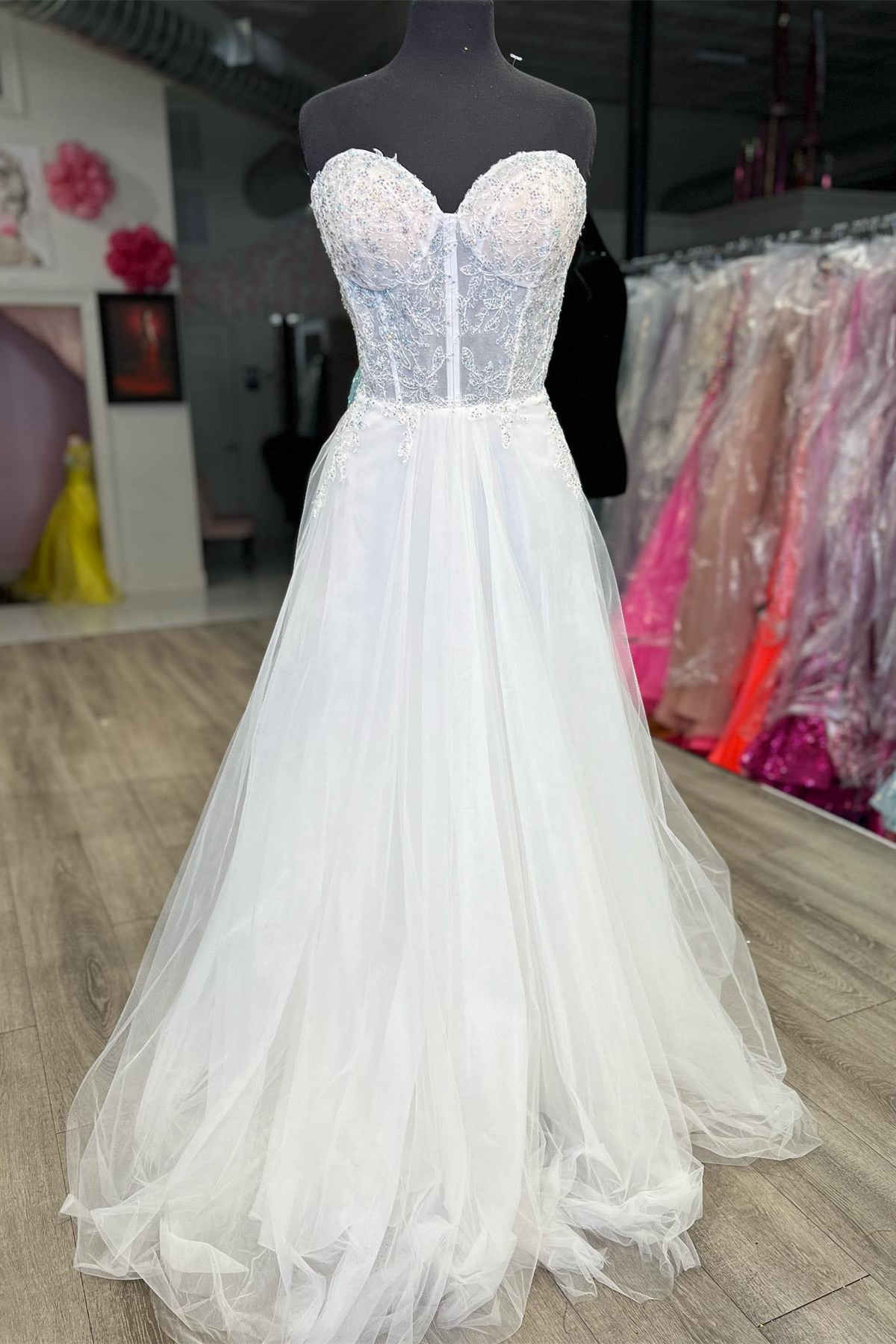 This strapless white lace corset dress is perfect for formal occasions. A sweetheart neckline and sheer bodice adorned with rhinestones provide an elegant look, while the A-line skirt and zipper back ensure comfortable wear. Make a lasting impression with timeless sophistication.