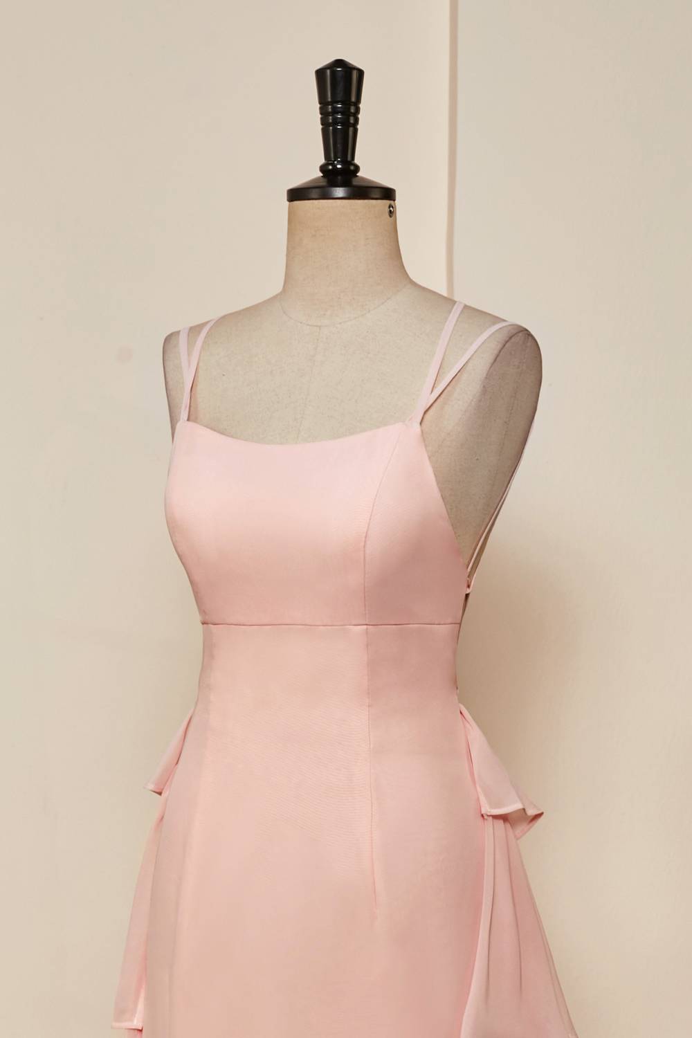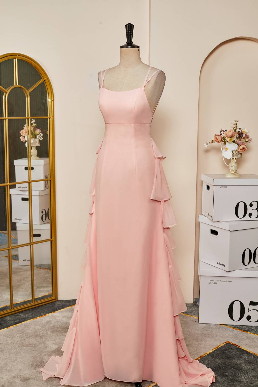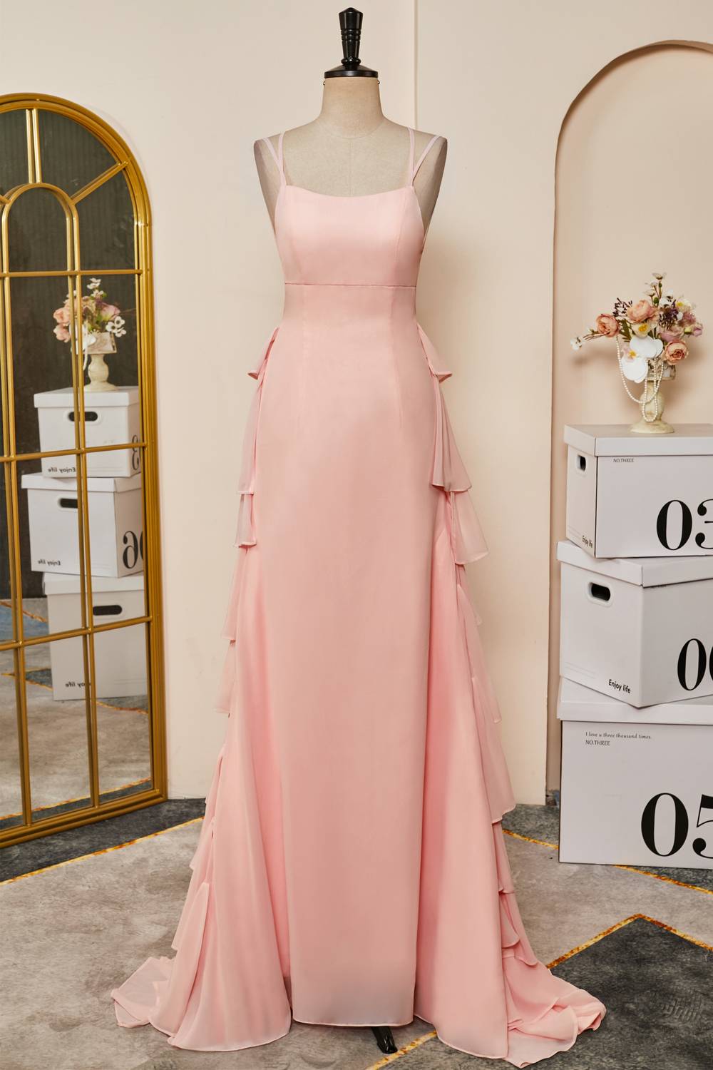 Look your best in this Straps Pink Ruffle Tiered Chiffon Long Prom Dress. Featuring a flattering scoop neckline, double straps, and a ruffle-tiered skirt with a sweep train, this dress will make any event extra special. The lace-up back ensures a perfect fit.