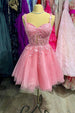 This homecoming dress features a sheer corset bodice with intricate appliques, complemented by delicate straps. Its a-line skirt gives a flattering silhouette, while a lace-up back ensures a perfect fit. Make a statement in this pink dress that combines elegance with modern details.