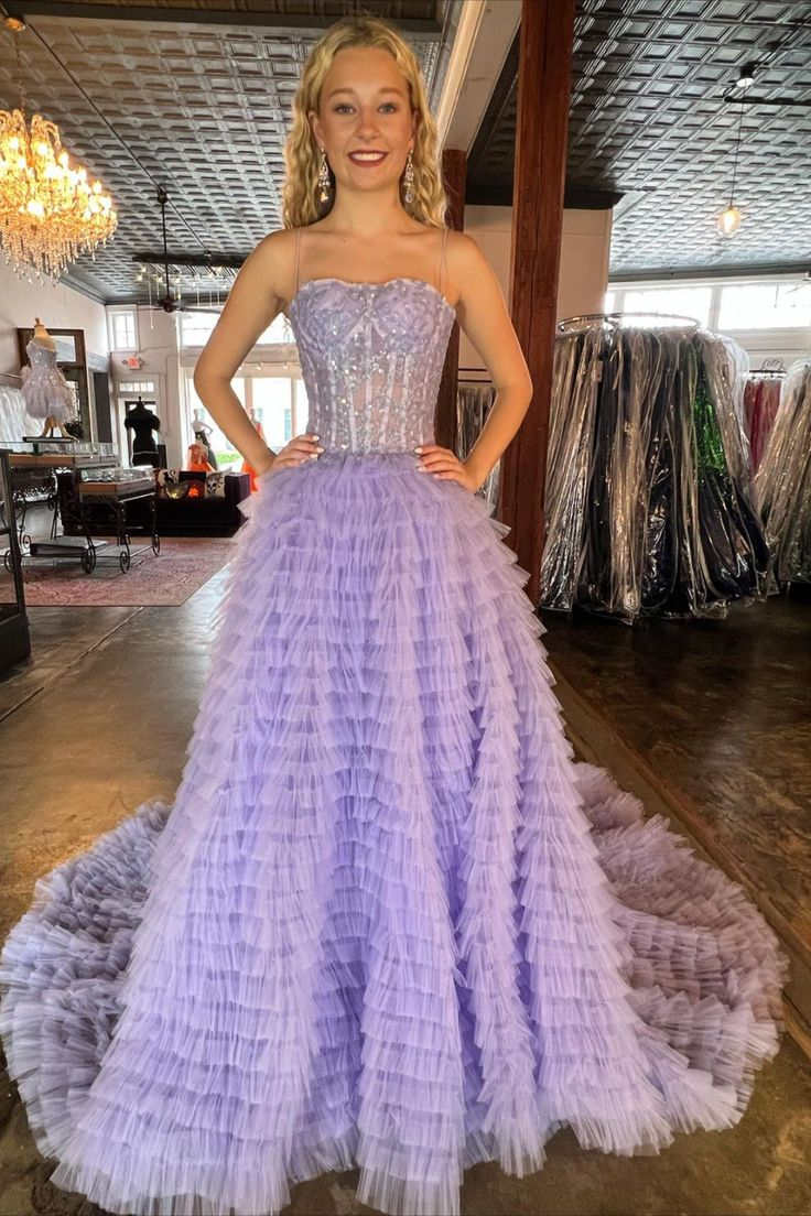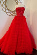 This gorgeous red ball gown features include spaghetti straps, sequin appliques, a tiered skirt, and a side slit for ease of movement. Crafted from high-quality tulle and adorned with detailed appliques, this stunning ball gown will make you shine at your next event.