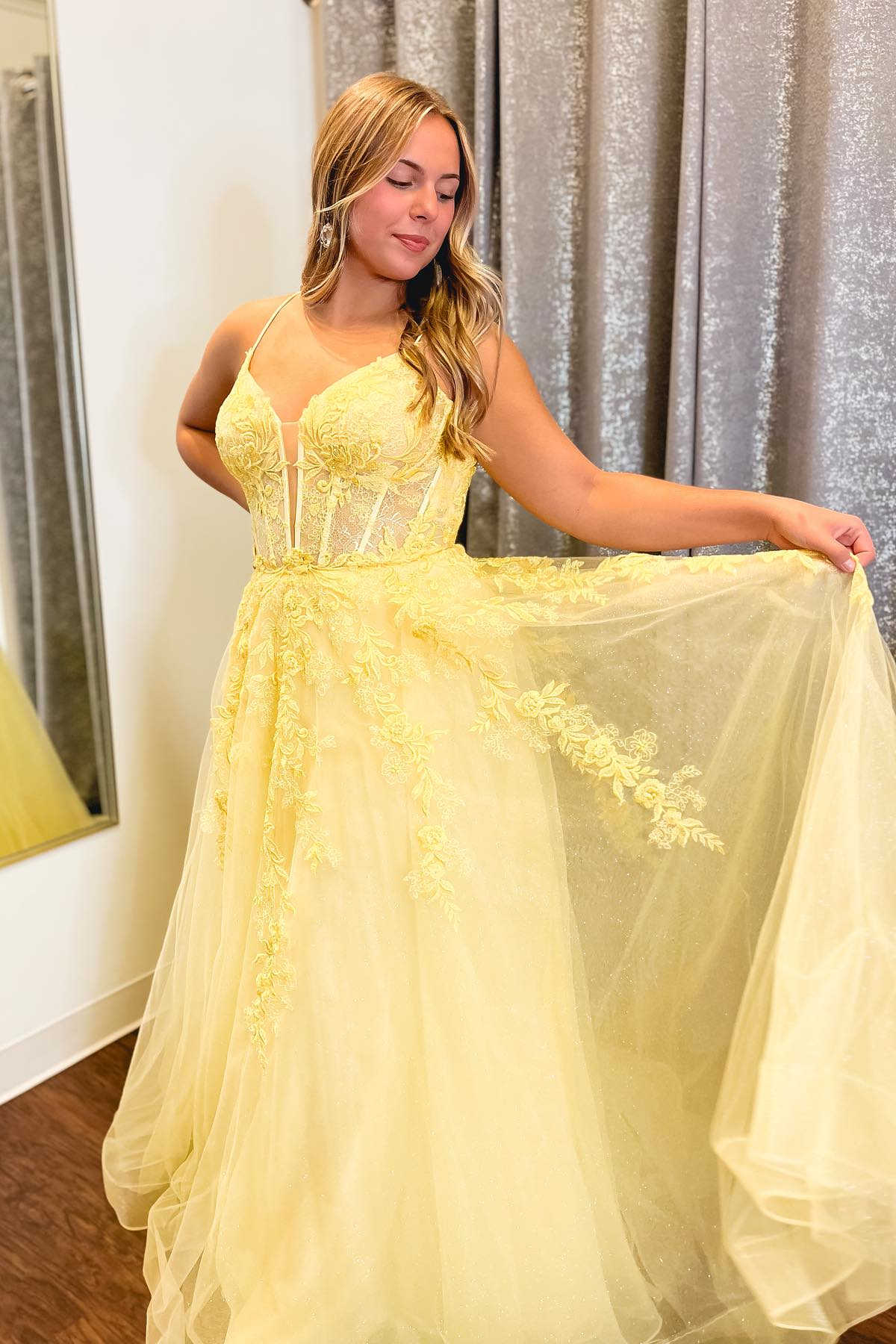 This elegant A-Line Long Formal Dress features delicate spaghetti straps, a sheer corset bodice adorned with opulent appliques, and a secure lace-up back. Perfect for special occasions, you'll make a chic statement while feeling comfortable and confident.